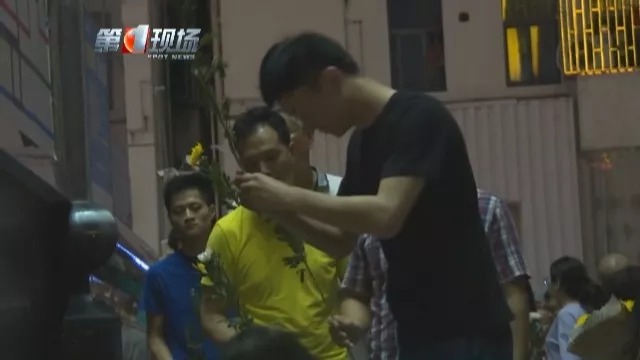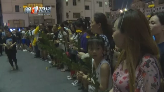 晚上7点30分,大家在有序组织下,排成一队,逐一走到花篮前,放下手中的鲜花,双手合十,并鞠躬致意。