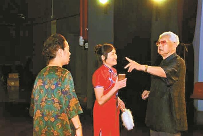 2019年4月,谭嗣英(右一)在2018~2019年深圳中老年艺术团队年度优秀节目展演《祖国颂》系列节目彩排时现场指导。