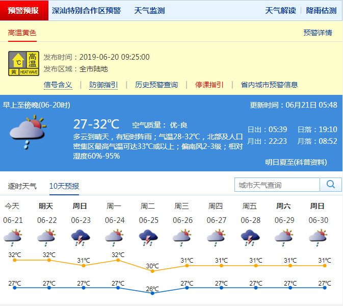 深圳新闻网2019年6月21日讯 连日来,鹏城天气炎热,空气湿度较大,体感闷热。市气象台于20日9时25分,在全市陆地发布高温黄色预警,最高气温普遍达到33℃。未来2~3天我市天气炎热至酷热,注意做好防暑降温。