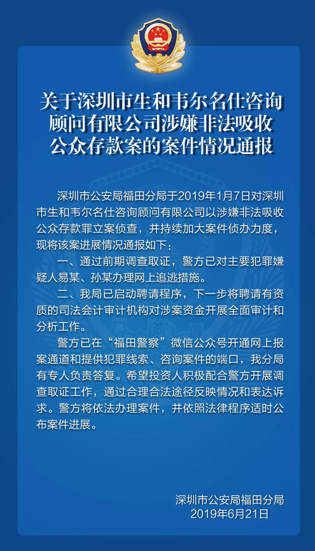 关于深圳市生和韦尔名仕咨询顾问有限公司涉嫌非法吸收公众存款案的案件情况通报