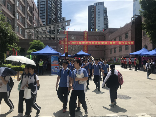 上午10时40分考试完毕,深圳高级中学考点的大部分考生笑逐颜开走出考场,有的考生还向守候在考场外的父母做出胜利的手势。