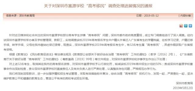 5月12日晚,深圳市教育局发布《关于对深圳市富源学校“高考移民”调查处理进展情况的通报》,通报称,经查实,深圳市富源学校2019年高考报名考生中,有32名考生属“高考移民”,弄虚作假获取广东省报考资格。按照相关法例,对涉事32名学生取消在深圳市的高考报名资格,对深圳市富源学校予以行政处罚,核减该校2019年高中招生计划的50%;责成深圳市富源学校董事会作出深刻检查,责令深圳市富源学校对直接责任人及有关负责人进行严肃处理,认真整改存在问题,严格规范办学行为。