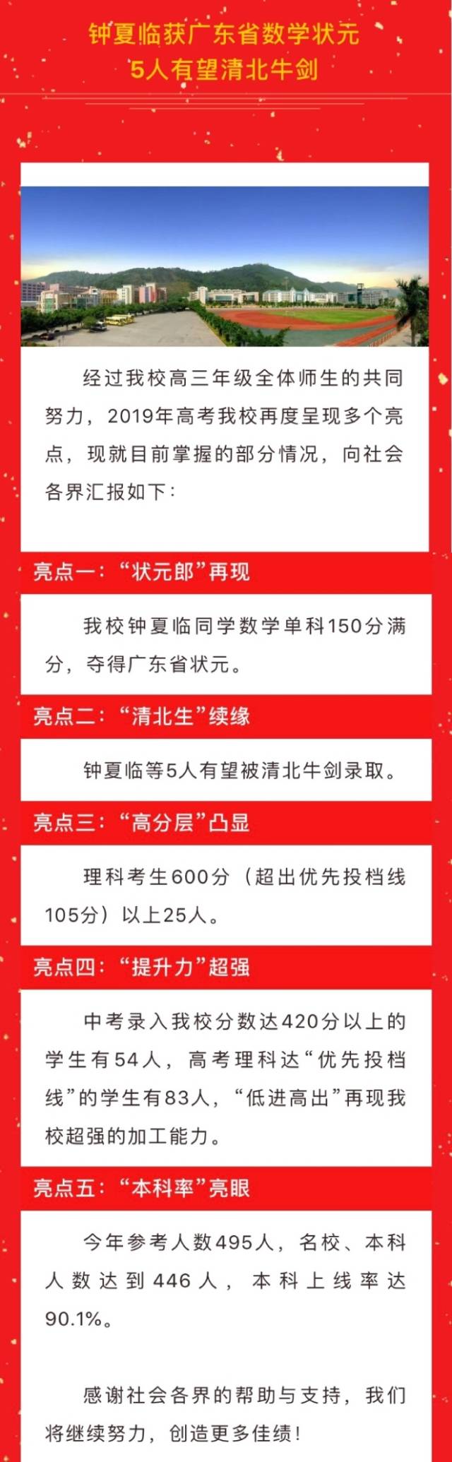 学校称其2019年高校“高分层”凸显,理科考生600分(超出优先投档线105分)以上25人;“本科率”亮眼,今年参考人数495人,名校、本科人数达到446人,本科上线率达90.1%;此外,还提到“提升力”,称中考录入该校分数达420分以上的学生有54人,高考理科达“优先投档线”的学生有83人,实现“低进高出”。