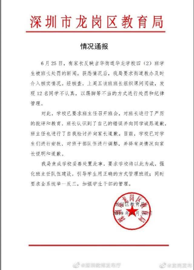 深圳新闻网2019年6月26日讯 近日,关于深圳一小学班长对同学拳打脚踢的舆情网上热传?记者26日从龙岗区教育局获悉,该班班长确实对12名学生以踢脚等不当方式进行纪律管理。事情发生后,学校已对该班班长进行了严厉的批评教育,该班班主任也进行自我检讨和道歉。目前,学校已对学生进行安抚,对班干部队伍进行了调整。
