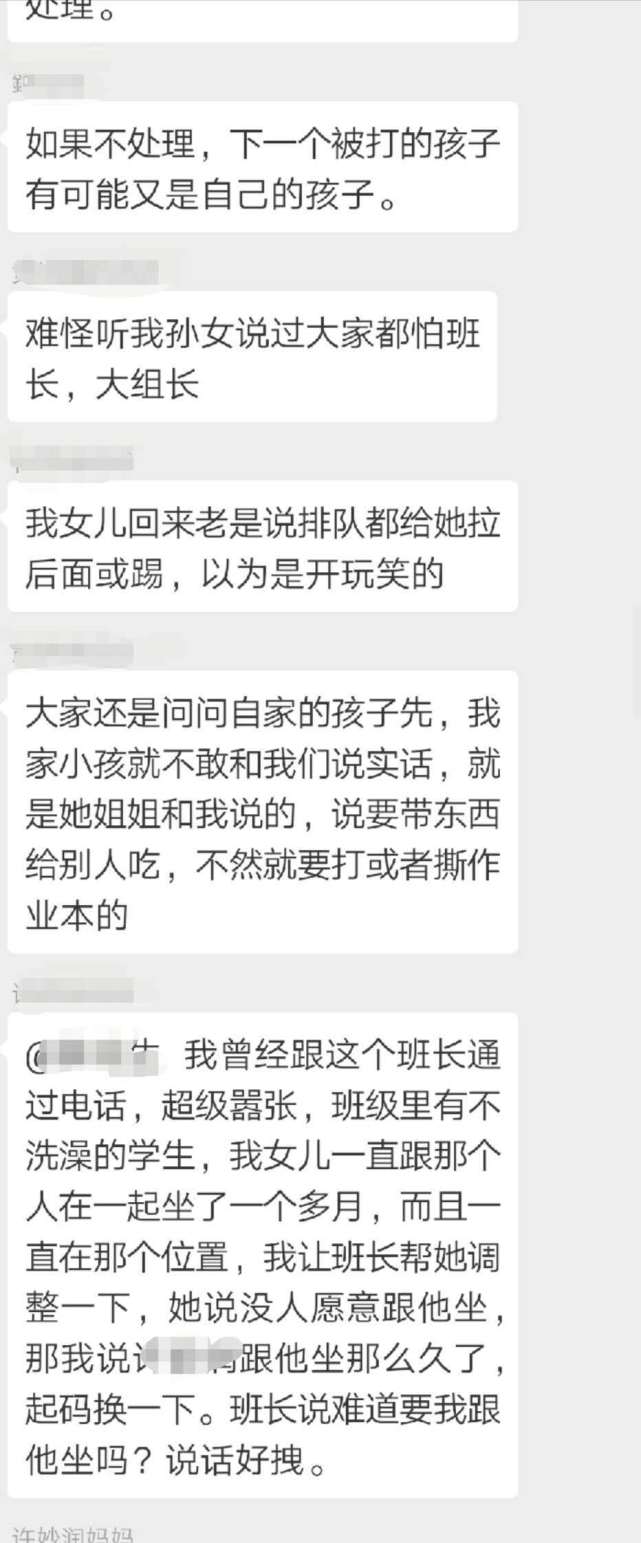 王先生把女儿的情况反映到家长群里,结果群里的家长纷纷表示,自己的孩子也反映当天遭遇到班长的殴打,有的孩子甚至“腿疼得难以走路”。而据孩子反映,其实类似的殴打在班上已经不止发生过一次。这名班长是女生,平时很受班主任的信任,经常利用班干部的权力随意惩罚学生。“她曾经多次要求班上同学给自己带零食吃,不然就会被撕作业和殴打,还威胁不准告诉家长。”王先生称,家长们已经将情况反映给班主任,但是班主任的反应“相当冷淡”,只是说会了解一下情况。25日下午,记者电话联系到了王先生女儿的班主任,他表示已经就此事对班长进行了批评教育,但对于班长此前多次殴打同学的行为他表示并不知情,“当初让这名同学做班长是因为她成绩好,而且守纪律。而且我觉得,孩子之间有些矛盾很正常。”班主任说。(记者 李东明)