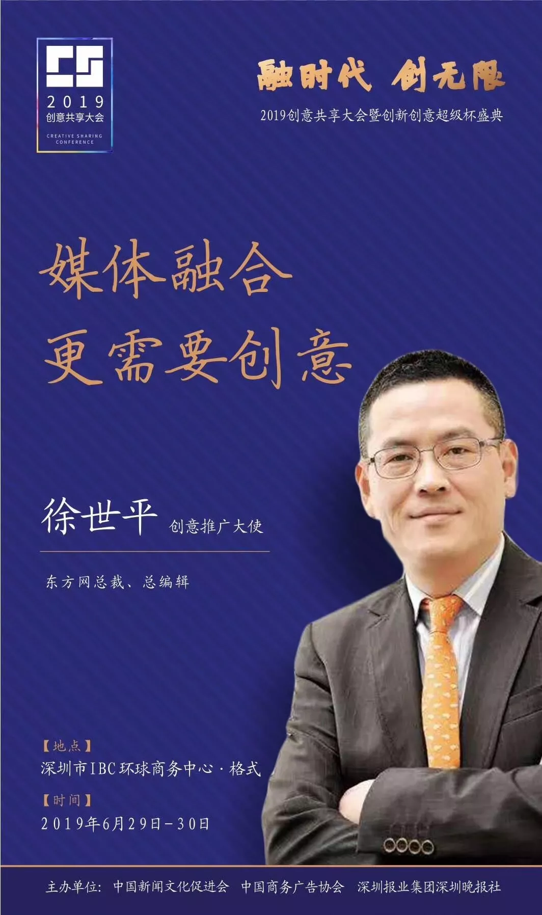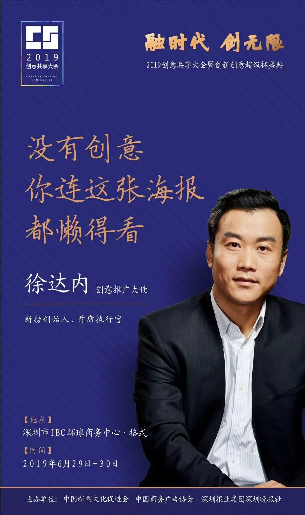为了展现创意中国的精神风貌和创意传媒的文化力量,构建创新创意共同体,擘画美好图景和未来趋势,2019年6月29日至30日,由中国新闻文化促进会、中国商务广告协会、深圳报业集团深圳晚报社等联合主办的“融时代创无限——2019创意共享大会暨创新创意超级杯盛典”将在深圳市IBC环球商务中心隆重举办。