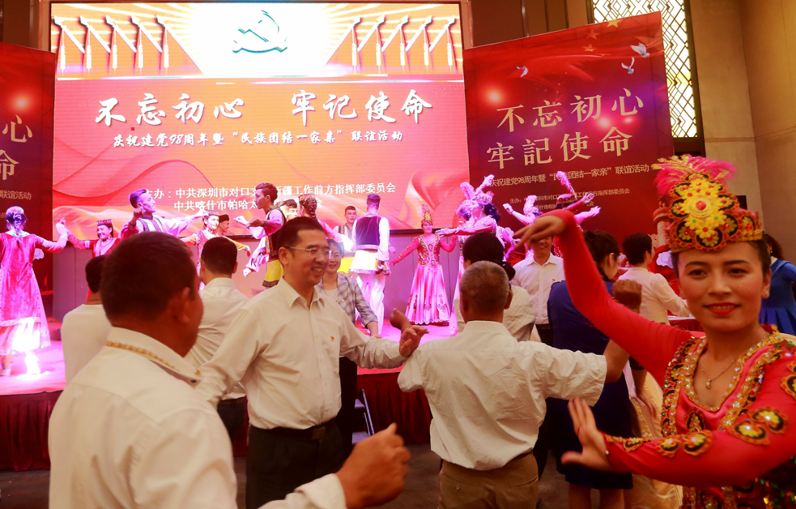 深圳新闻网2019年7月1日讯 盛夏七月,红色党旗迎风飘,为积极响应党中央关于在全党开展“不忘初心牢记使命”主题教育的重大部署。6月30日,深圳援疆前方指挥部、中共喀什市帕哈太克里乡委员会联合组织开展庆祝建党98周年暨“民族团结一家亲联谊”活动。喀什地区行署领导、全体援疆干部人才、帕哈太克里乡结亲群众等300余人参与活动。