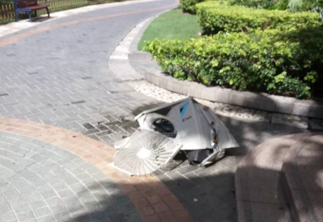 深广电第一现场2019年7月1日讯 今天下午,福田区万科金色家园小区一台空调主机从11楼坠下!巨大的声音把业主吓得不轻!!!空调外机应该是固定好的怎么就会掉下来了?