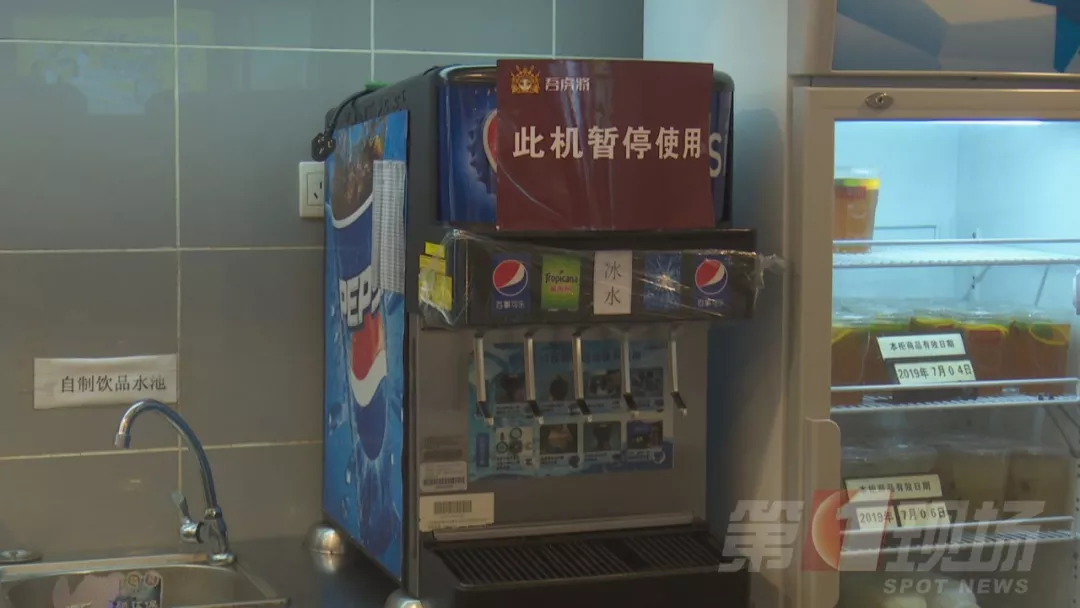 今天中午,记者跟随辖区市监所执法人员来到涉事门店现场检查。据了解,2号事发后,店里的这台饮料机已经暂停使用,目前饮料出口是用保鲜膜封住的。店方称,饮料机,每个月由百事可乐厂家人员深层清洗一次,他们的员工是每天对饮料机的糖浆管道和滤嘴进行清洗,都有清洗记录。