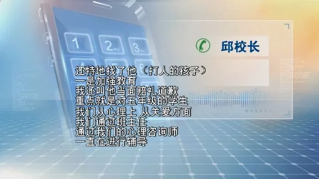 随后记者前往了小詹所在的小学。邱校长表示打人者彬彬本身是一个自控力较弱的学生,他们此前也有进行过多次批评教育,而这次事发在非上课时间的校外,他们也有立即介入对事情进行了解,并且协调双方进行协商,在小詹出现应激反应后,他们也立马联系了心理医生进行辅导。