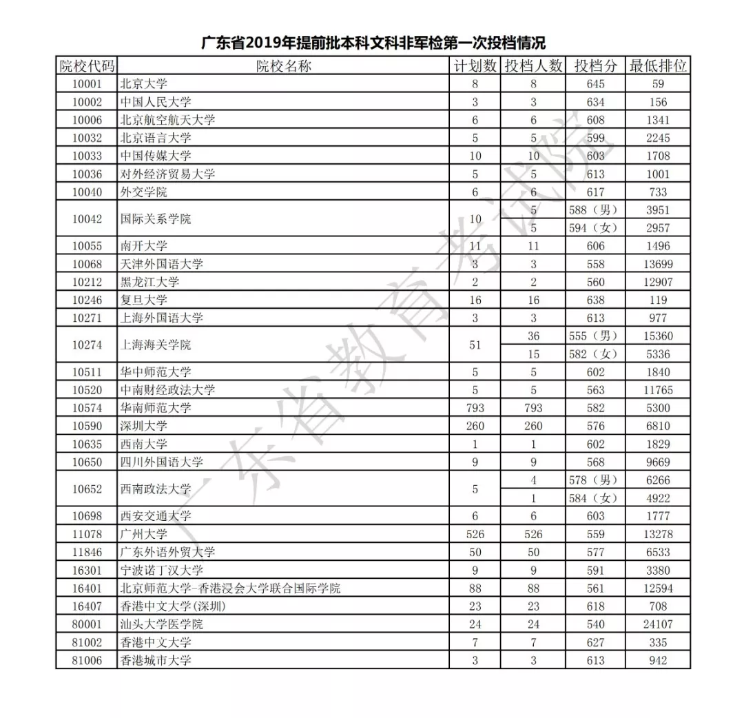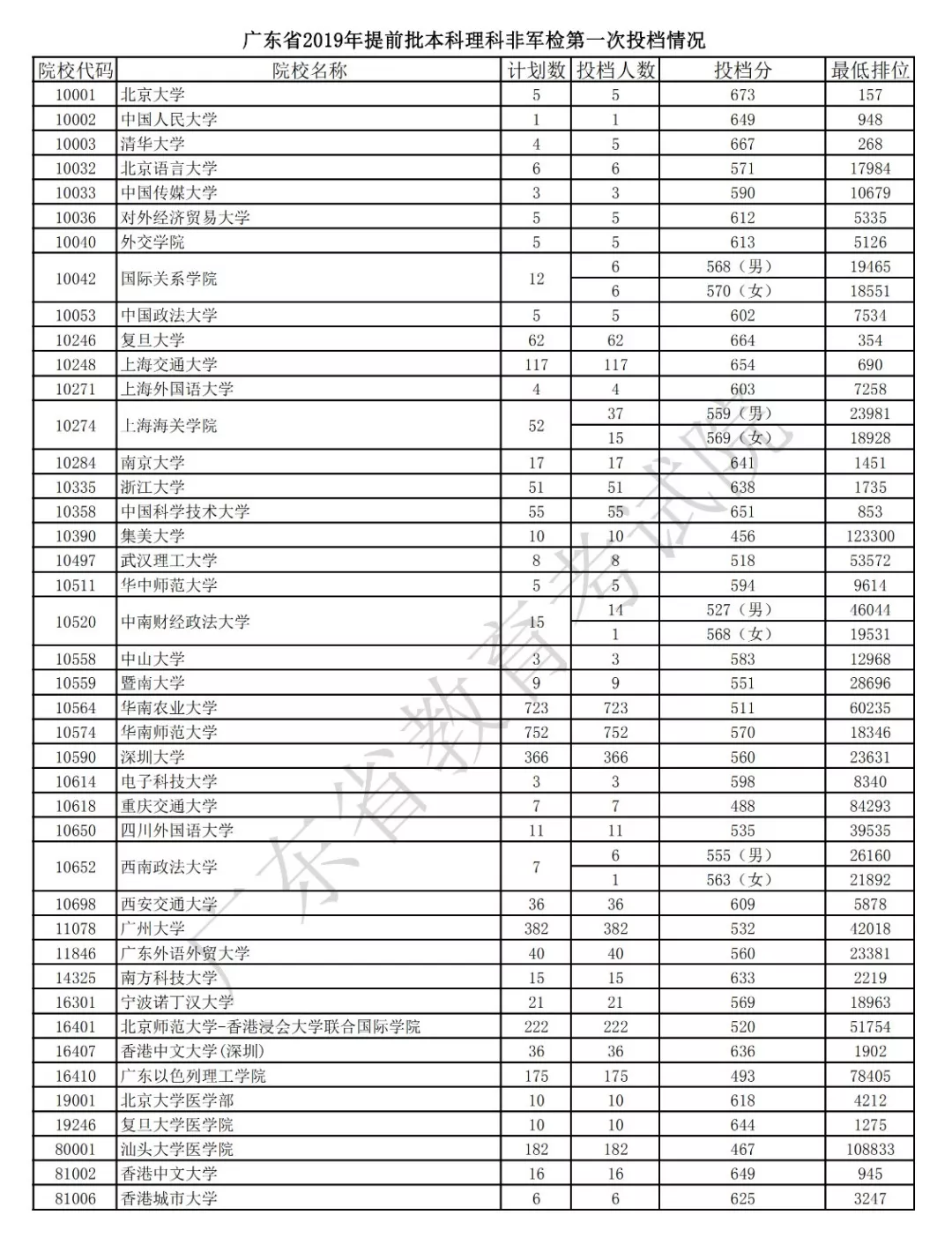 广东省2019年提前批本科非军检第一次投档情况出来啦!投档情况如下: