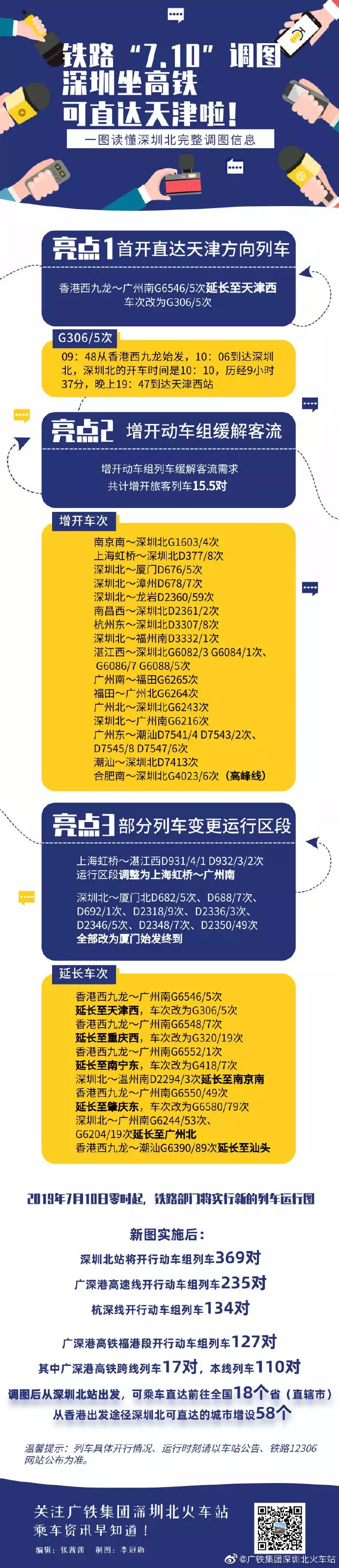 根据新的运行图安排,深圳北站将开行动车组列车369对,广深港高速线开行动车组列车235对;杭深线开行动车组列车134对。“7·10”调图后,深圳北站首开前往天津方向列车,届时从深圳北站出发,可乘车直达前往全国18个省(直辖市);从香港出发途径深圳北可直达的城市增设58个。