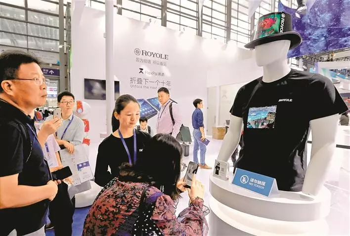 ▲图为柔宇公司展示可以穿戴在身上的薄膜显示器。深圳特区报记者 李伟文 摄