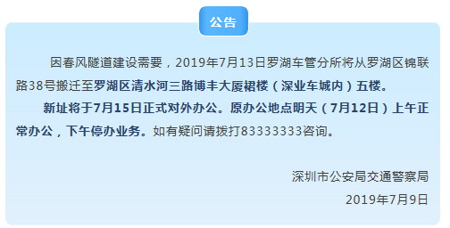 据深圳车管所消息, 因春风隧道建设需要,2019年7月13日罗湖车管分所将从罗湖区锦联路38号搬迁至罗湖区清水河三路博丰大厦裙楼(深业车城内)五楼。新址将于7月15日正式对外办公。原办公地点明天(7月12日)上午正常办公,下午停办业务。