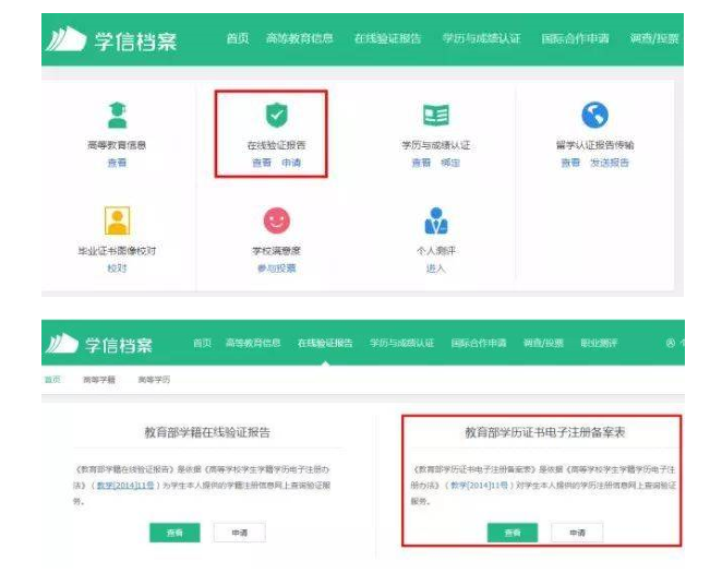 登录之后,点击“申请在线验证报告”,选择查看《教育部学历证书电子注册备案表》。