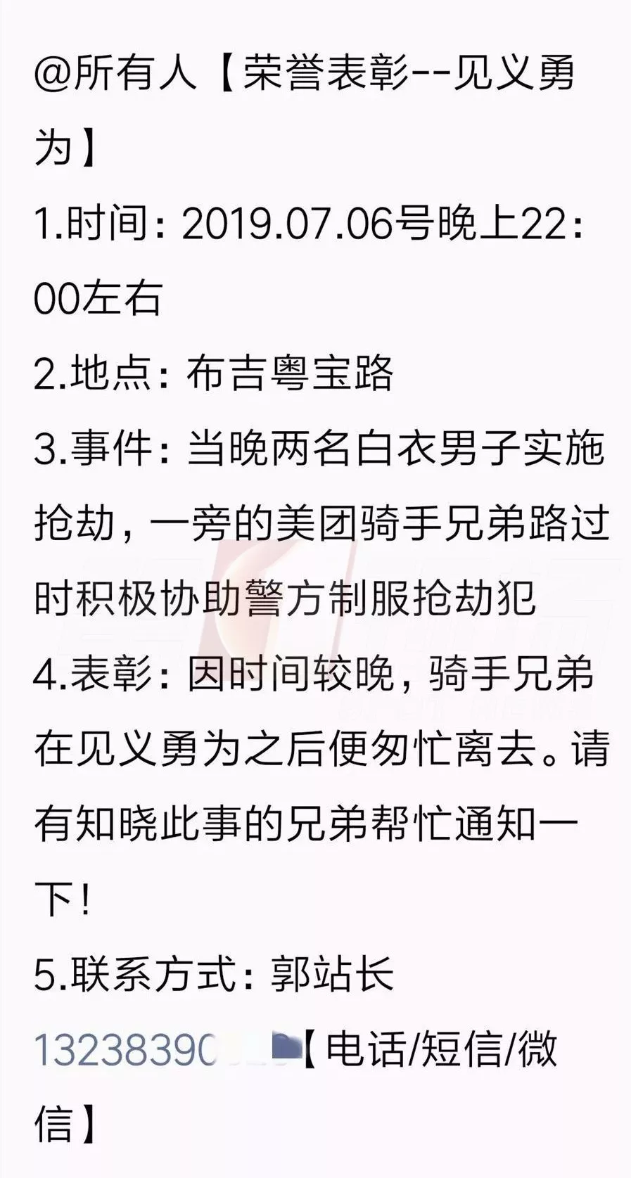 为了寻找这位低调的外卖小哥,布吉派出所找到了美团公司。一番周折,7月7日下午,见义勇为的外卖小哥被找到了。