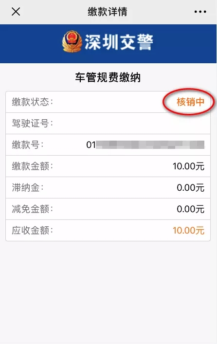 03 提交缴费后,核对缴款号(前面会多01),应收金额为10元。缴费后再次查询该流水,状态为“核销中”(即缴费成功)。