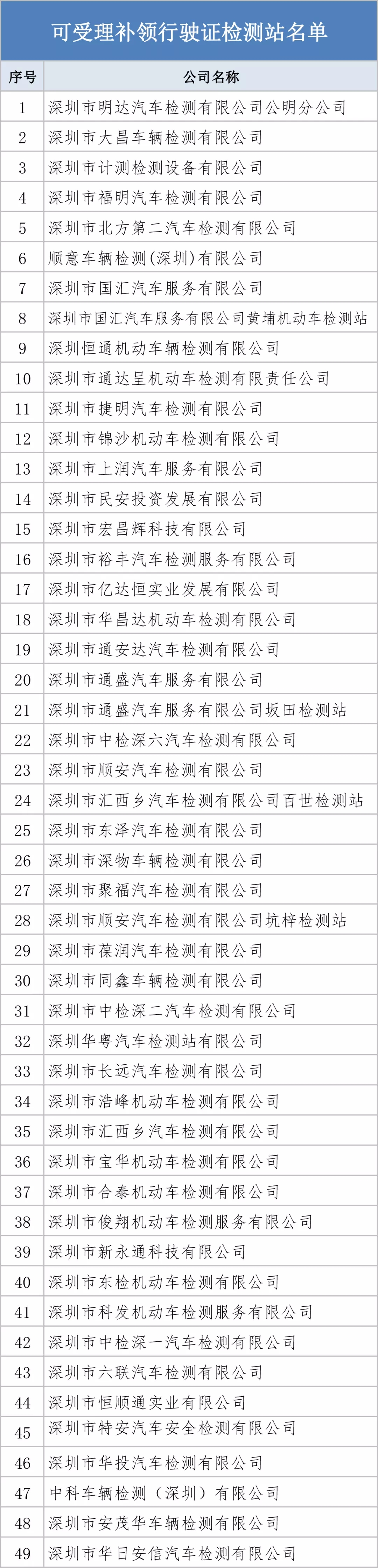 仅限深圳机动车,在下列49家检测站办理年检业务才可以在检测站申请补换领行驶证!