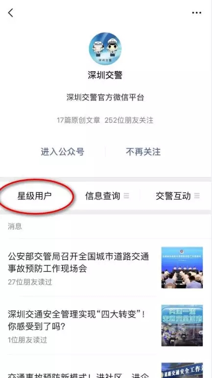 01 车主本人/代办人关注【深圳交警】微信公众号,点击进入【星级用户】,注册登录星级用户后,在页面选择【车管规费缴纳】。