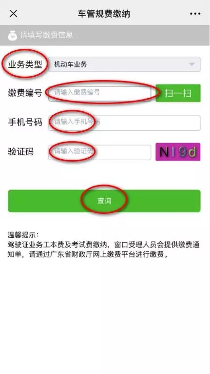 02 业务类型选择【机动车业务】,输入缴费编号(缴费流水号),填写本人/代理人手机号码、验证码后,点击“查询”。