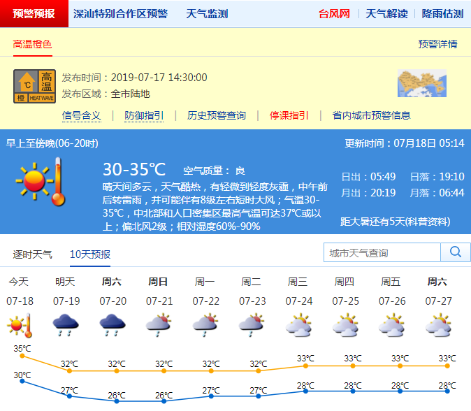 深圳新闻网2019年7月18日讯 受台风“丹娜丝”外围下沉气流影响,昨日我市高温天气加剧,全市最高39℃,出现在罗湖区东湖街道。市气象台于昨日14时30分将全市高温黄色预警信号升级为橙色。这也是今年我市首个高温橙色预警信号。