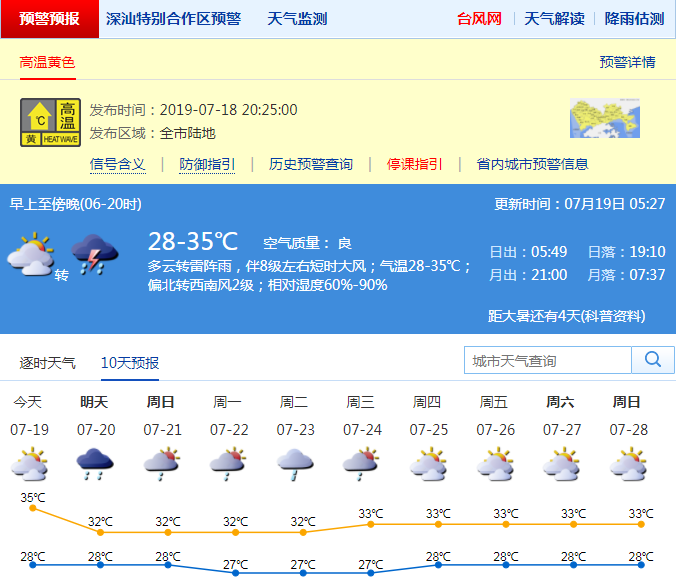 深圳新闻网2019年7月19日讯 受台风外围下沉气流影响,19日多云为主,天气酷热;受西南气流影响,午后有雷雨,雨时伴有短时强降水和8级左右大风;气温28-35℃,中北部和人口密集区最高气温可达37℃以上。18日白天,全市气温普遍在35℃~37℃左右,其中最高气温达到39.6℃。高温橙色预警信号继续生效中。