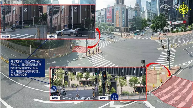 福田红荔/农轩路口暑假期间行人过街流量减少,取消东转北、北转西两处渠化灯控,改为黄闪控制。