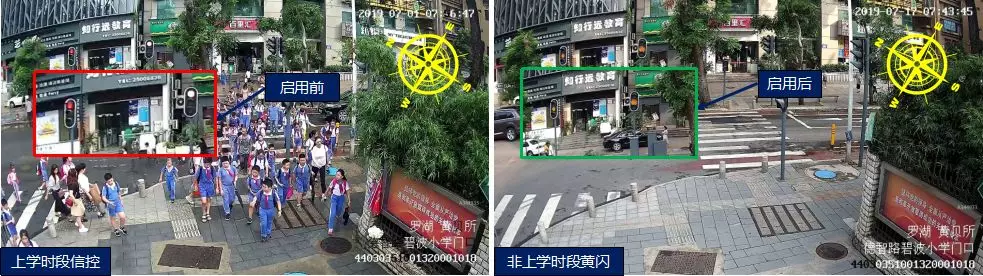 罗湖黄贝/德智路口上下学期间采取灯控设置,规范路口内行车秩序,保证机动车与行人的安全。因暑期行人、机动车流量均明显减少,蜀黍采取全天黄闪控制,提高机动车通行效率。