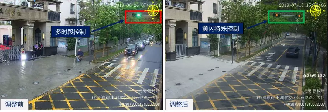 龙岗怡翠/新亚洲学校路口行人过街需求主要集中于上下学期间,近期暑期开始,行人过街需求小,路口调整至全天黄闪控制模式,以提高机动车通行效率。