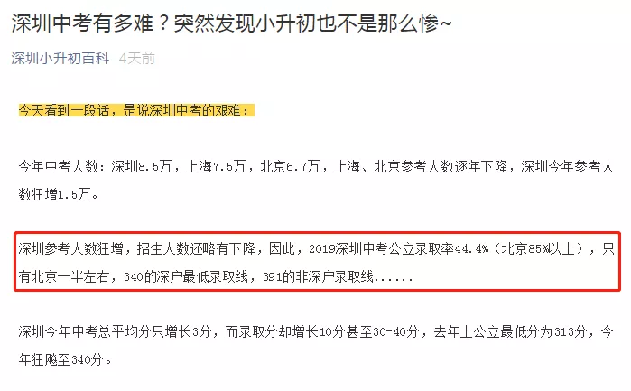 再看看“深圳小升初百科”前几日发表的文章《深圳中考有多难?突然发现小升初也不是那么惨~》