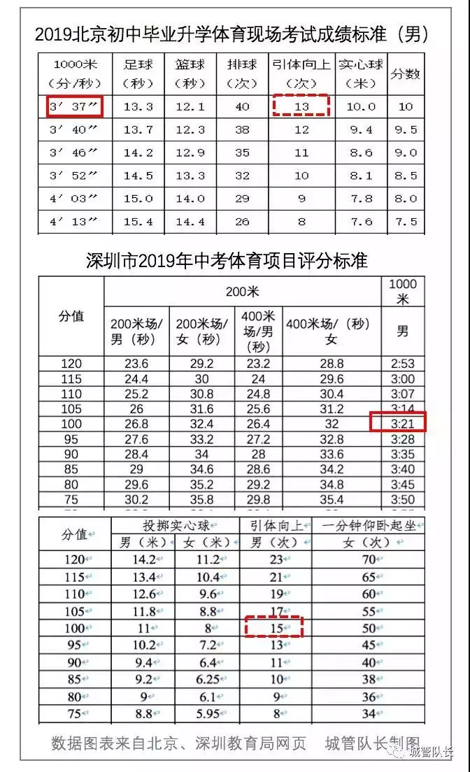 体育成绩,男子1000米跑,北京满分3分37秒,上海满分3分34秒,广州满分3分45秒,而深圳满分3分21秒,且深圳中考体育占总分比更高。意味着,如果后面跟着一只大老虎,深圳的孩子要比北京的孩子跑快16秒才能不被老虎吃掉。其他项目基本上对深圳的孩子要求更高,比如引体向上,深圳孩子满分15个,北京孩子满分13个,上海孩子满分11个。网友:凭什么咱的力气要更大……
