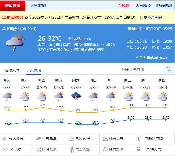 深圳新闻网2019年7月23日讯 市气象局预计深圳23日多云为主,有(雷)阵雨,部分时间雨势较大,局部地区雨量可达中到大雨量级;气温27-32℃,中午前后体感略显闷热;西南风2-3级;相对湿度65%-95%。24-26日转炎热天气,午后易激发热对流性降雨,最高气温33-35℃;27-28日降雨增多,部分时间雨势较大。
