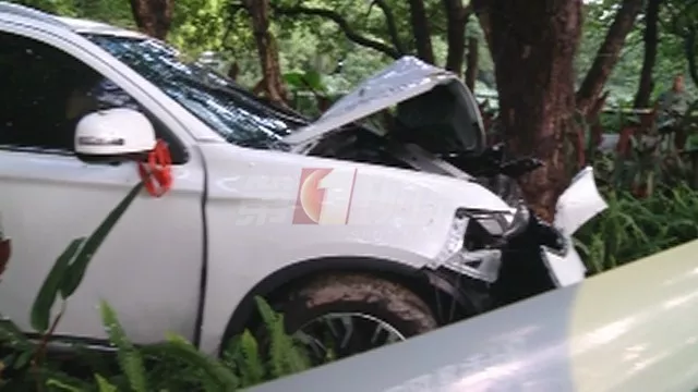 事情发生在7月21日下午3点50分,在事发现场可以看到一辆白色三菱汽车撞到了一棵树,车头被撞得完全凹陷,支离破碎。