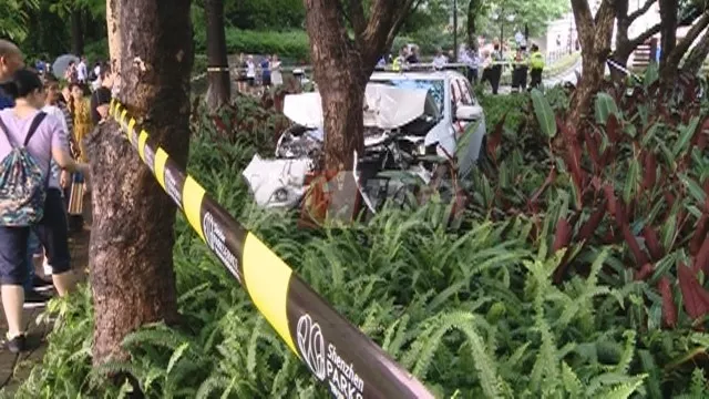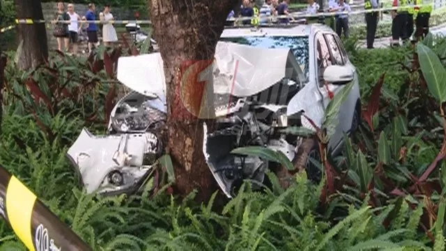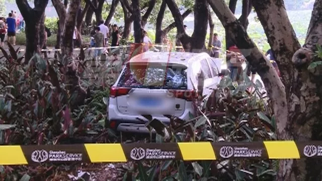 据现场目击者称当时车辆直接碾过人行绿道并撞飞了两个小孩,最终车头撞向荷花塘边的一棵大树才停住,如果不是这棵大树阻挡,这辆车很有可能会冲向荷花塘里。