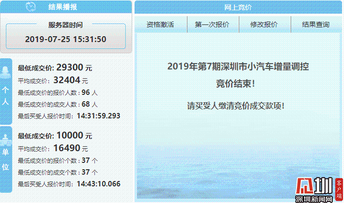 见圳客户端•深圳新闻网2019年7月25日讯(见圳客户端 深圳新闻网记者 涂胜)7月25日下午,深圳市2019年第7期小汽车增量指标竞价结果出炉,个人最低成交价为29300元,平均成交价为32404元,与上期相比,个人最低成交价上涨5100元,平均成交价上涨445元。但与深圳出台机动车车牌指标放宽政策之前相比,竞拍价几乎“腰斩”(2019年第五期个人最低成交价为60100元,平均成交价为69873元)。