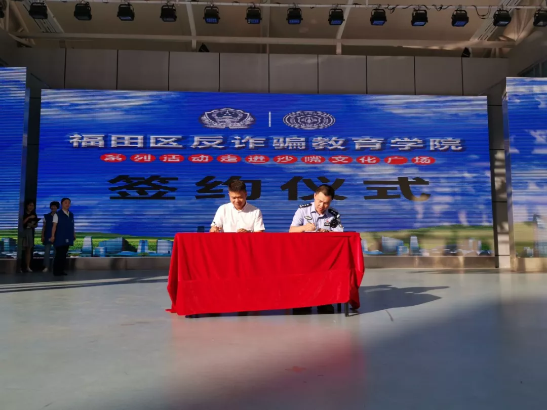 活动现场,肖剑平所长与沙头街道办党工委副书记熊新清及沙嘴实业股份有限公司签署了《福田反诈骗教育专刊》战略合作协议。