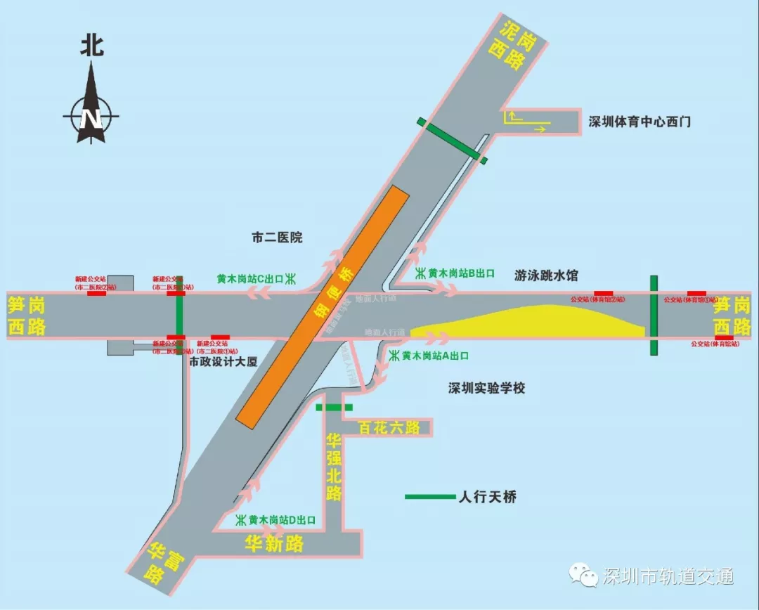 笋岗西路—华富路四个方位人行道接顺连续,图示地面人行道及人行天桥在此阶段可使用。(详见图1)