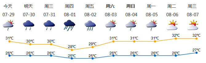 预计30-31日阴天间多云,有阵雨或雷阵雨,局部暴雨;8月1日 -2日有一次暴雨降雨过程。8月3日 -5日降雨减弱,多云有阵雨或雷阵雨。