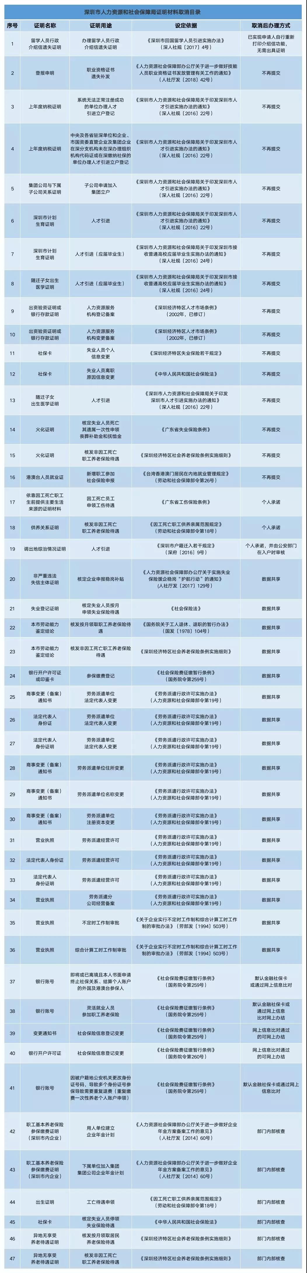 记者梳理发现,这47项证明材料包括:新增职工参加社会保险申报,港澳台人员就业证不用再提交;人才引进(应届毕业生),深圳市计划生育证明、随迁子女出生医学证明无需再提交;劳务派遣单位法定代表人变更,法定代表人身份证、商事变更(备案)通知书等。