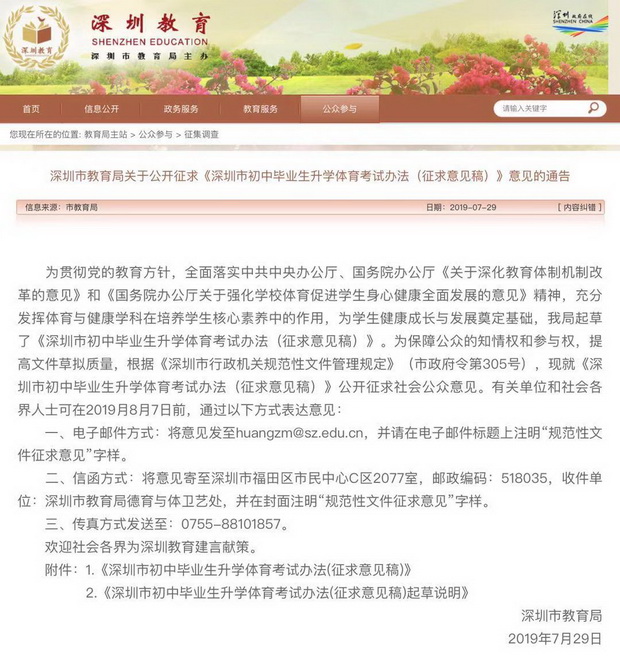 见圳客户端·深圳新闻网2019年7月31日讯(见圳客户端·深圳新闻网记者 余俐洁)日前,市教育局发布《深圳市初中毕业生升学体育考试办法(征求意见稿)》(以下简称《考试办法》)。根据《考试办法》中考体育必考科目调整为中长跑(男生1000米,女生800米)或100米游泳(不限泳姿)二选一,考试总分由现行的30分调整为50分,从2019年入学的初一学生开始实施,即到2022年及以后的中考考生适用新方案。征求意见时间至2019年8月7日。
