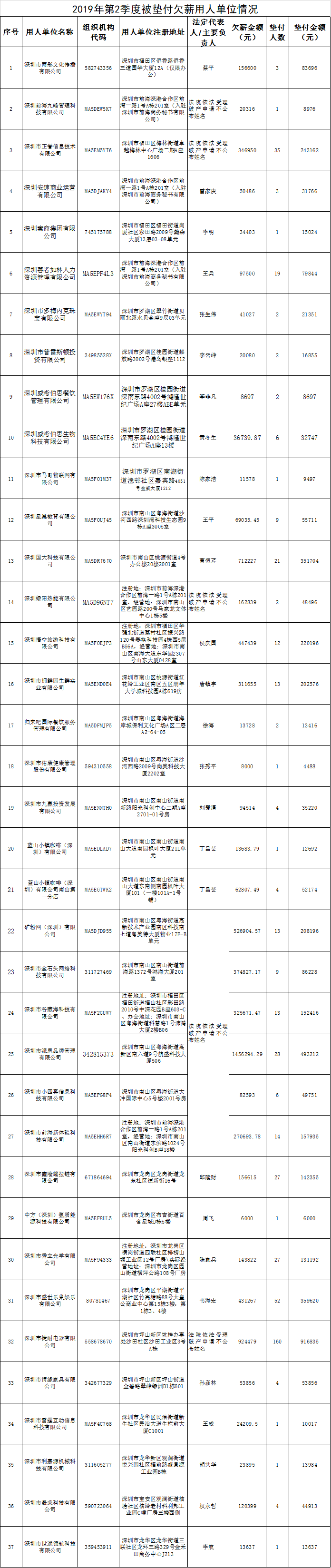深圳特区报2019年8月1日讯 深圳市人力资源和社会保障局日前曝光了37家被垫付欠薪企业,对2019年第2季度拖欠员工工资并由我市各区人力资源部门启动了市欠薪保障基金垫付员工工资的用人单位情况予以通告。