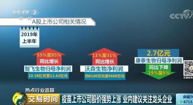 在已经公布的2019年半年度业绩中:智飞生物归母净利润10.58亿元~12.62亿元,同比增长55%~85%;沃森生物净利润约8100万元~9600万元,同比增长11%~31%;康泰生物归母净利润为:2.7亿元,同比下降15%-5%。