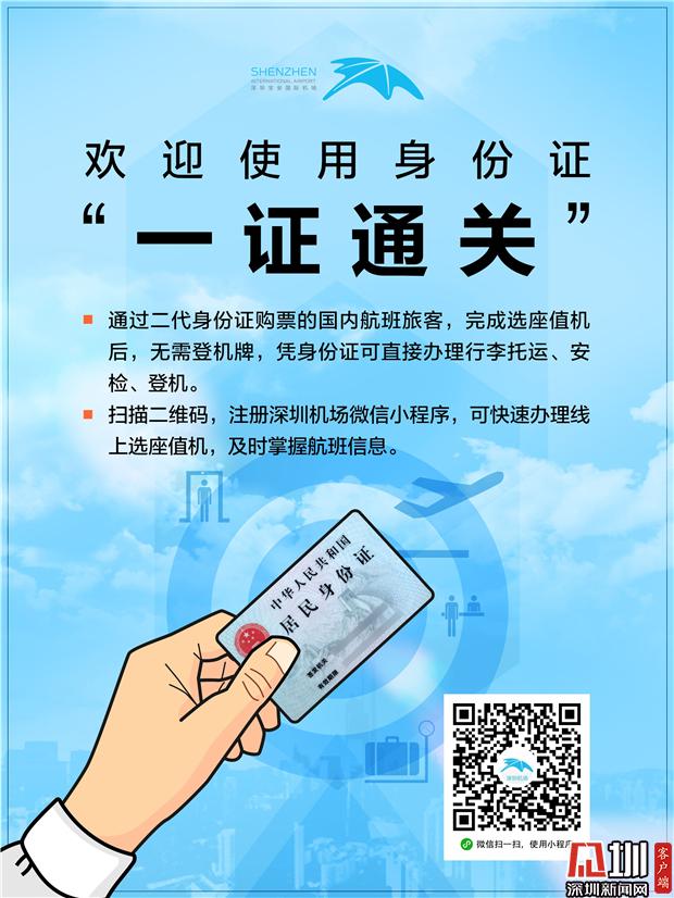 深圳新闻网2019年8月1日讯(见圳客户端、深圳新闻网记者 涂胜 通讯员 叶丹)记者从深圳机场了解到,即日起,深圳机场全面试行国内航班身份证“一证通关”服务。今后,使用二代身份证购买机票的旅客,在完成选座值机后,仅需出示身份证即可直接办理行李托运、安检和登机手续,全程无需再出示登机牌。