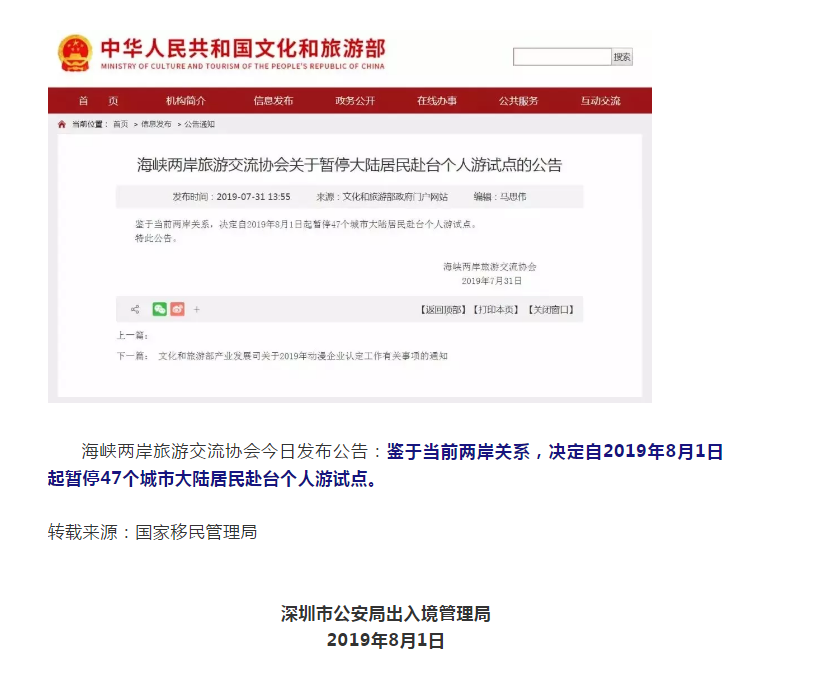 8月1日,暂停47个城市大陆居民赴台个人游试点