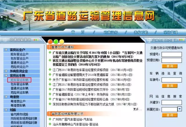登录广东省道路运输管理信息网,点击左侧菜单栏中的「客货运车辆」,再点击「客班车客运车辆」,就能进入到查询页面。