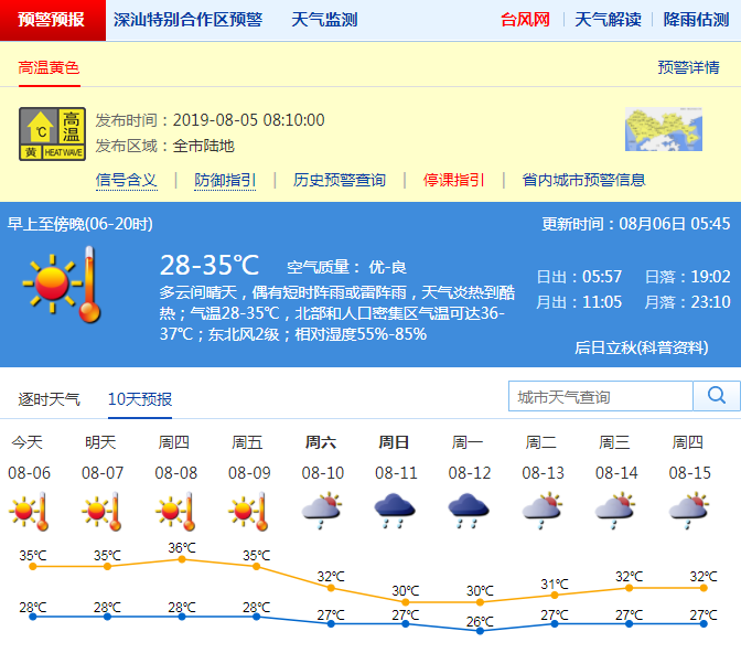 最新的气象预报显示,未来4-5天,深圳持续高温天气。8月6-9日受副热带高压和台风“利奇马”偏北下沉气流的影响,深圳市以晴天为主,高温天气持续,大部分地区最高气温34-36度,中北部和人口密集区可达37度或以上;10-11日转雷阵雨。