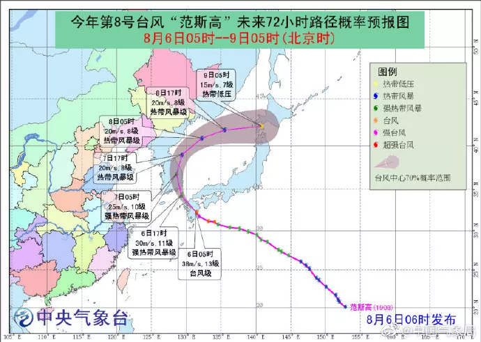 预计,“范斯高”将以每小时25-30公里的速度继续向西北方向移动,将于今天晚上再次登陆韩国南部,尔后逐渐转向东北方向移动,强度逐渐减弱。
