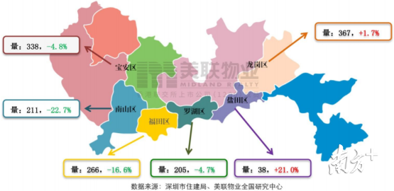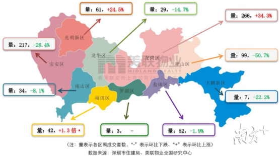 在成交格局方面,龙岗区与宝安区尽管成交量彼长此消,但是两区成交量仍然保持前两名的格局。