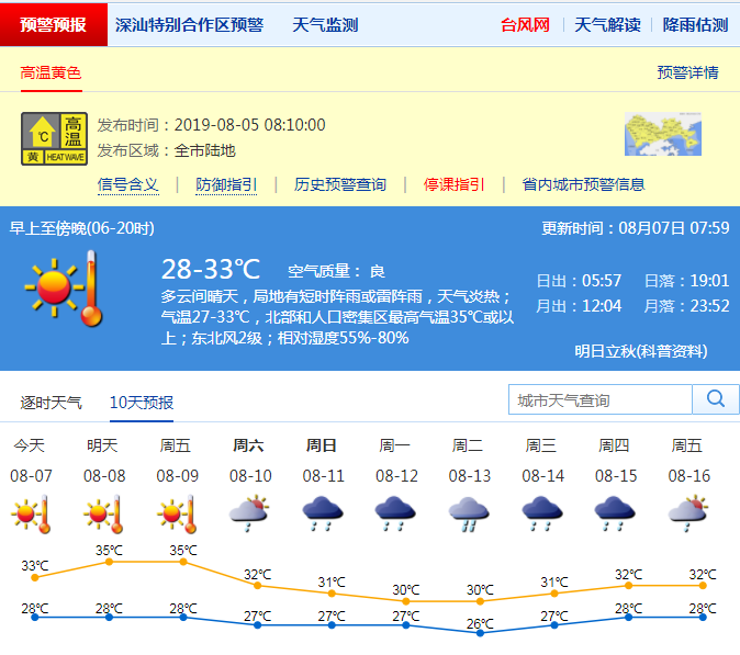 见圳客户端·深圳新闻网2019年8月7日讯 深圳今日气温28-33℃,多云间晴天,局地有短时阵雨或雷阵雨,天气炎热。预计8-9日天气持续炎热,大部分地区最高气温33-35℃,中北部和人口密集区36℃或以上,午后有局地热雷雨;10-12日有阵雨或雷阵雨,局部大雨。今年第9号台风“利奇马”(强热带风暴级)未来趋向台湾以东洋面,预计对我市无直接风雨影响。