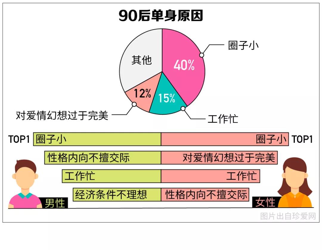调查结果发现,圈子小(40%)、工作忙(15%)、对爱情幻想过于完美(12%)为90后单身的主要原因。就性别差异而言,除了圈子小之外,男性单身的主要原因是性格内向不擅交际(33.53%)、工作忙(32.07%)以及经济条件不理想(19.02%)。女性单身的主要原因则是对爱情幻想过于完美(29.67%)、工作忙(28.04%)及性格内向不擅交际(14.82%)。从学历背景看,学历越高越容易受困于生活圈子小和工作忙带来的择偶问题,而且博士人群对爱情幻想过于完美的比例比其他学历的人群更高。